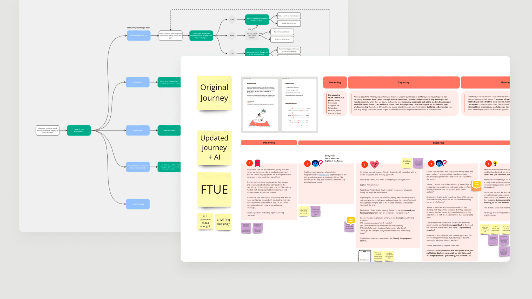 To bring the team onto the same page, I mapped the buyer journey in Miro and layered in where AI could help, from early exploration to making decisions. The board captured the core insight: affordability anxiety, fear of missing out, and the need for guidance over automation.