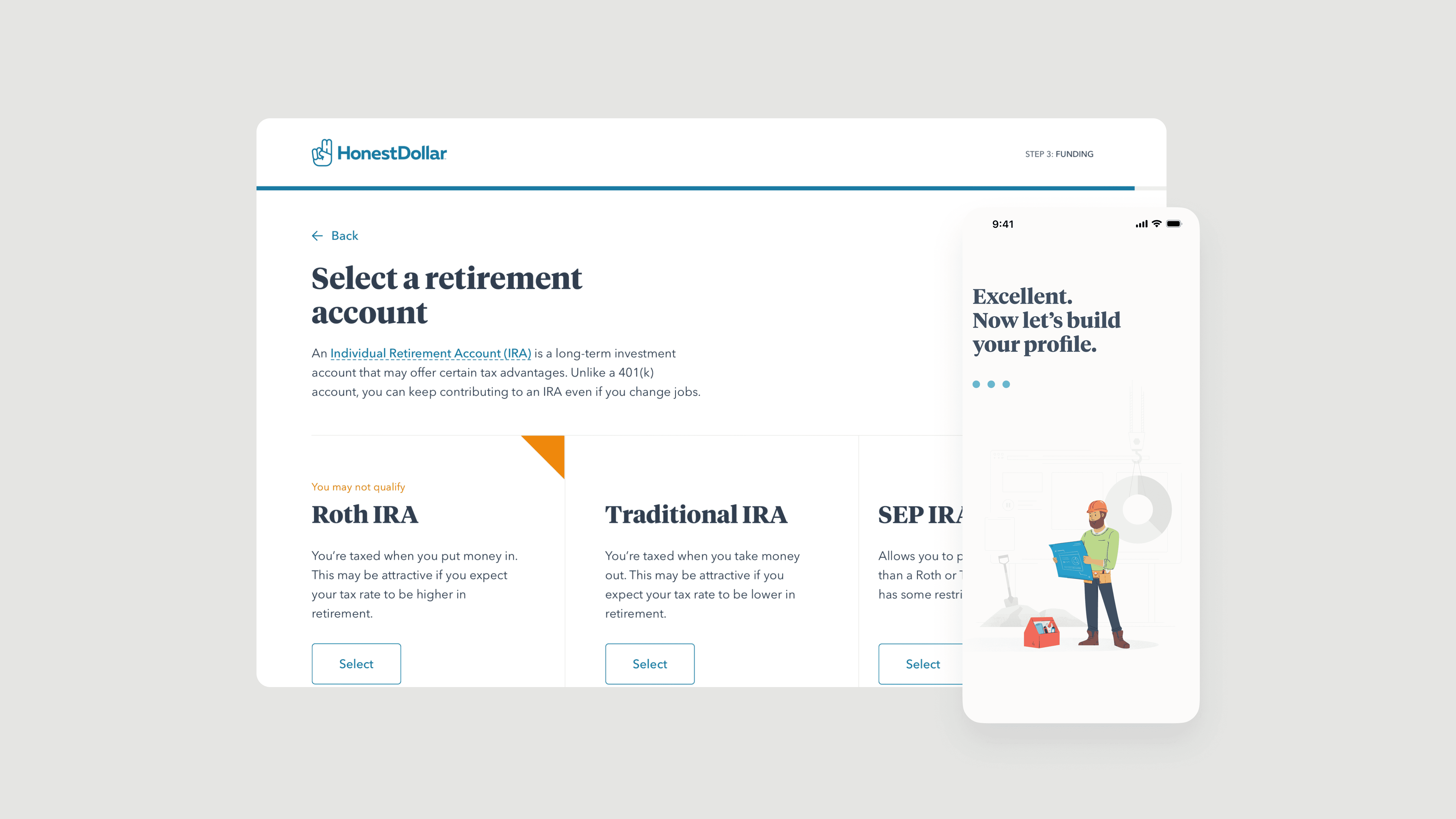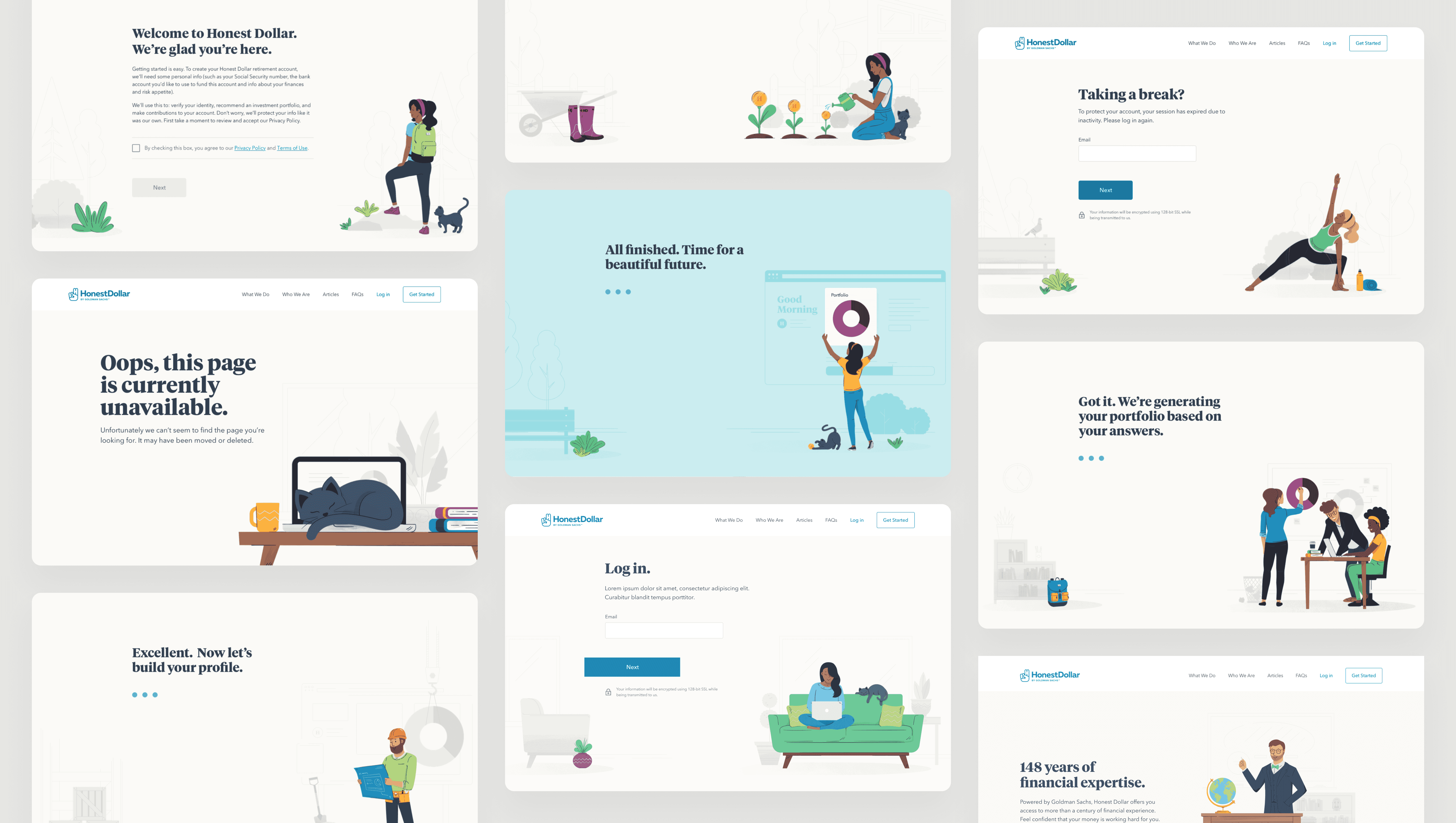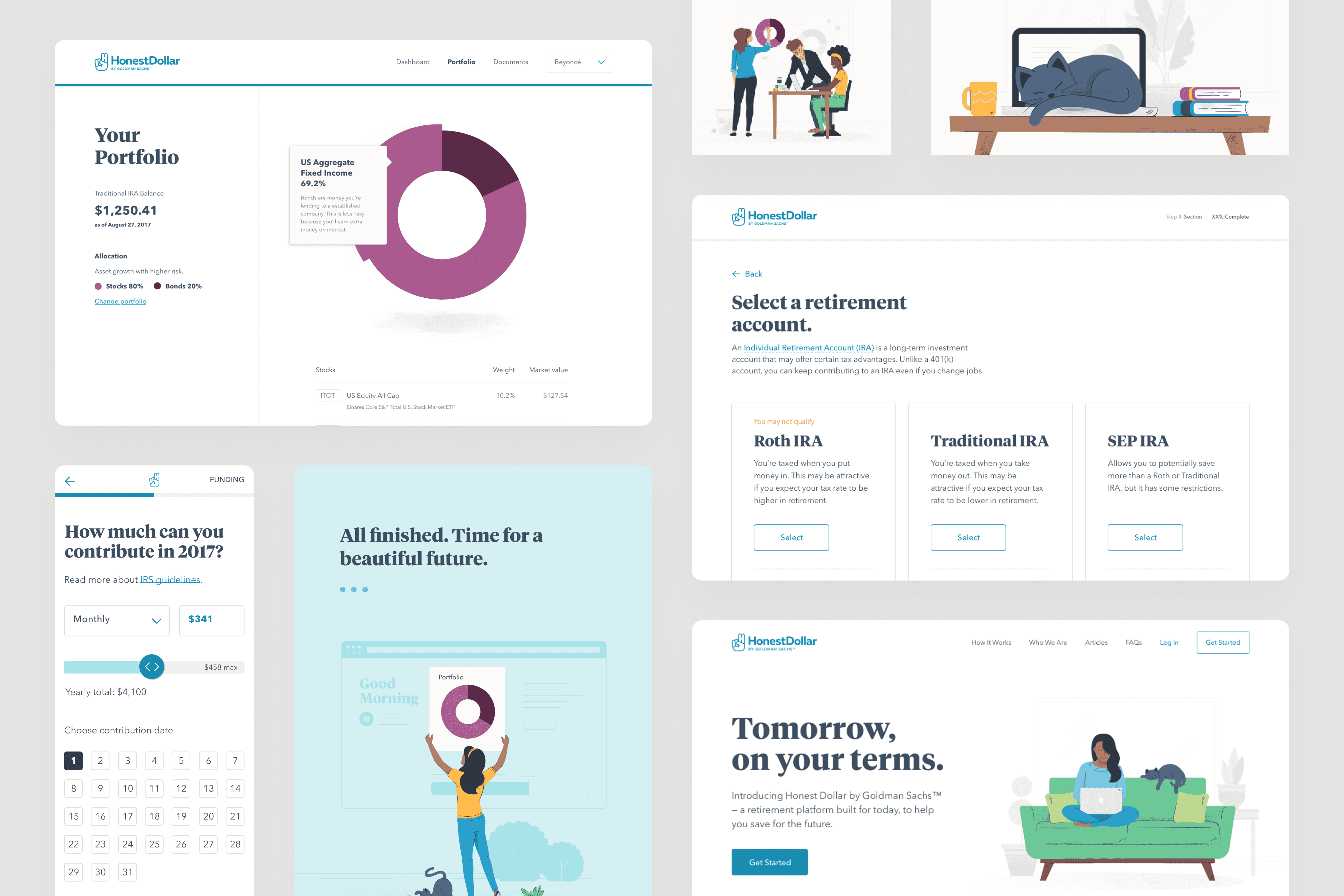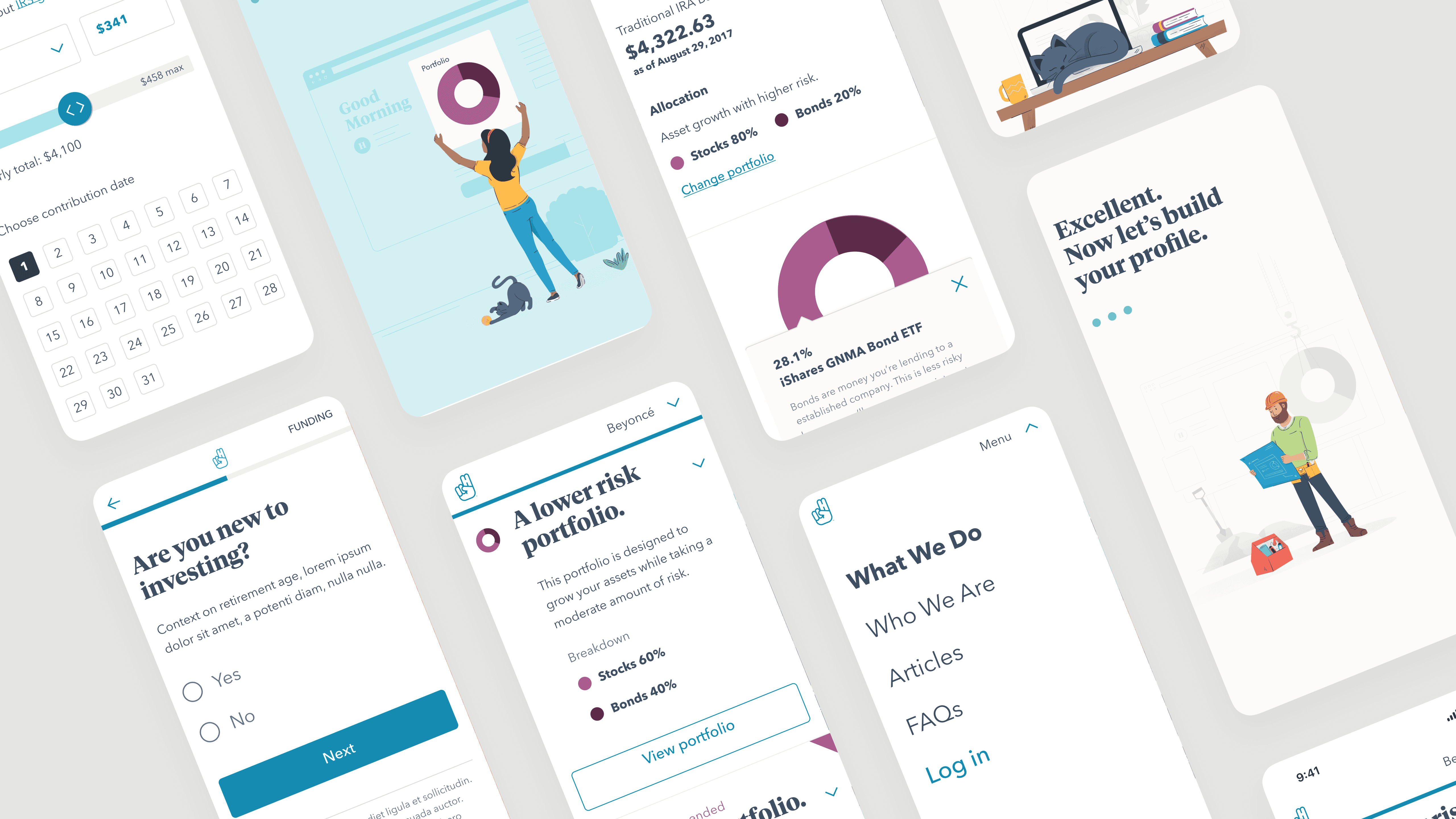I art directed custom illustrations showing real people in everyday situations. A person hiking with their cat. Someone working from their couch. A construction worker. A yoga instructor. These visuals made retirement planning feel accessible by showing it's for everyone, not just Wall Street types.